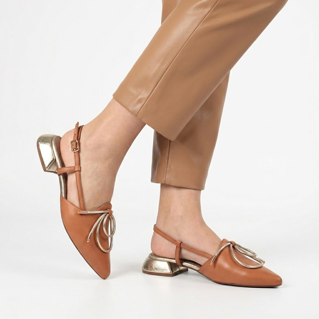 Tieto štýlové dámske poltopánky typu slingback, vyrobené z hnedej kože, kombinujú klasickú eleganciu s modernými dizajnovými prvkami. Špicatá špička a jemné remienky dodávajú obuvi ženský vzhľad, zatiaľ čo unikátny zlatý podpätok s kovovým efektom a dekoratívna ozdoba na prednej časti dodávajú topánkam jedinečný charakter. Nastaviteľný remienok s prackou zaisťuje stabilné uchytenie a pohodlný nízky podpätok je ideálny na celodenné nosenie, či už ide o pracovný deň v kancelárii alebo elegantnú večernú udalosť.